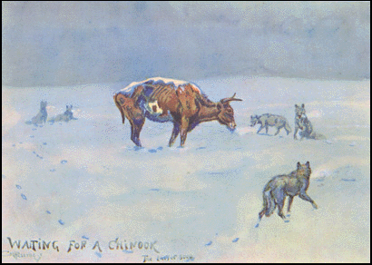Charlie Russell painted of his experience of the winter of 1886-87. (I like how the native species are waiting for …)